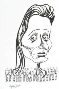 Zeichnungen sind Karikaturen, die teilweise ins Groteske und ins Makabre gehen.