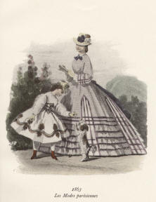 Les Modes parisiennes 1863. Die handkolorierte Graphik zeigt zwei Damen