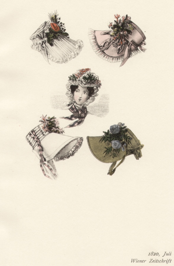 Damenhüte aus dem 18. Jahrhundert. Blattformat 12 x 19 cm. Motivgröße 5,8 x