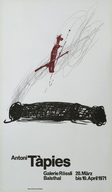 Antoni Tàpies - Original Farblithografie für die Ausstellung vom 20. März - 10. April 1971 bei der Galerie Rössli, Balsthal. Gedruckt bei der Erker-Presse St. Gallen. Größe 90 x 53 cm. Sehr guter Zustand.