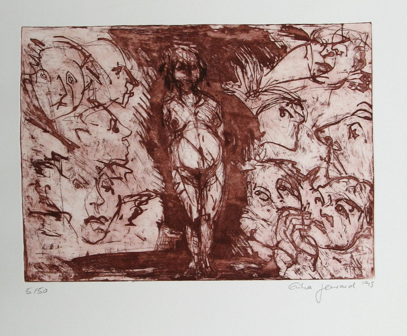 Ika Gerrard - Ohne Titel (weiblicher Akt). Original Radierung von Ika Gerrard signiert. Motiv Format 21,7 x 30 cm auf Blattformat 52,5 x 39,2 cm. Radierung von der Künstlerin mit Bleistift von Hand signiert, datiert 93 (1993) und nummeriert. Auflage 50 Exemplare. Verso mit zwei kleinen Montagespuren, sonst sehr guter Zustand.