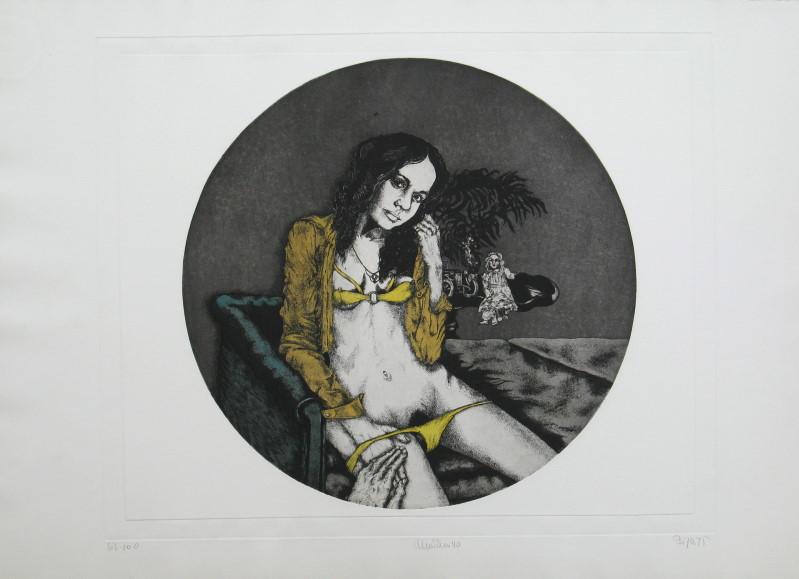 Carl Bianga (auch Karl Bianga) - München 40 (erotische Darstellung eines jungen Mädchens). Original kolorierte Radierung signiert und nummeriert von Carl Bianga. Motiv Format 40,8 x 40,8 cm auf Blattformat 52,8 x 78,7 cm. Die handkolorierte Radierung mit Prägedruck ist mit Bleistift von Hand signiert, datiert 75 (1975), betitelt und nummeriert. Auflage 100 Exemplare. Blattrand etwas wellig, sonst sehr guter Zustand.
