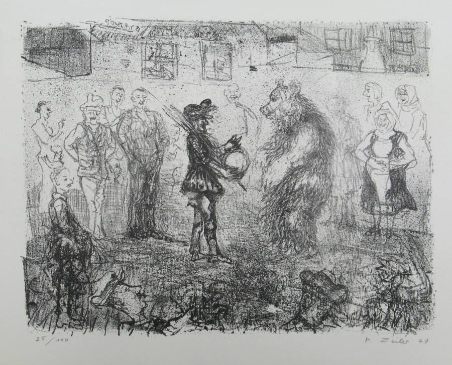 Peter Zeiler - o. T. (Tanzbär mit Zuschauern). Original Lithographie
