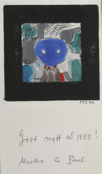 Blatt ist als Grußkarte gefaltet. Im unteren leeren Bereich Grüße des Künstlers