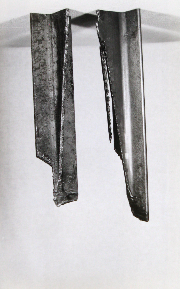 1990 habe ich in einem weiß gestrichenen, fensterlosen Innenraum von ca. 3 x 3 Metern Größe und einer Deckenhöhe von 2,50 m diese beiden Eisenskulpturen mit Dübeln und Gewinden unter die Decke montiert.
