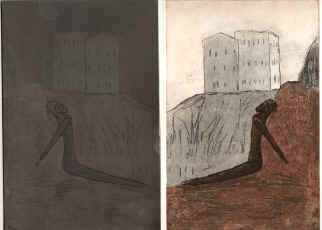 Bei dieser Technik löst man viel Zucker in Tusche auf. Dadurch wird die Tusche dickflüssiger. Mit Pinsel oder Feder zeichnet man mit der Zuckertusche auf die Druckplatte. Nachdem die Zeichnung getrocknet ist, trägt man eine dünne Schicht Asphaltlack darüber. Im anschließenden Wasserbad löst sich der Zucker. Die Zeichnung wird freigesprengt und kann danach geätzt werden. Bei großflächiger Zeichnung, die auch flächig gedruckt werden soll, muss zusätzlich eine Aquatinta aufgebracht werden, bevor geätzt wird. Ich zeige diese Technik in meinem Probedruck zum Proceß von Franz Kafka "Im Steinbruch". Die fertigen Radierungen finden Sie auf meiner Seite Franz Kafka Process